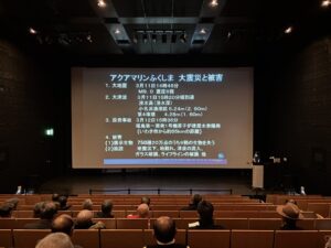 ここでは、館内シアタールームにおいて震災学習プログラムを受講。震災発生当時に水族館職員が撮影した写真等を用いて被害状況の説明があり、リアルな津波の映像を拝見した際には、参加者が言葉を失う瞬間もあった。様々な命を預かる水族館という施設が、どのような被害を受けてどのように復興していったか、その道のりを学習した。